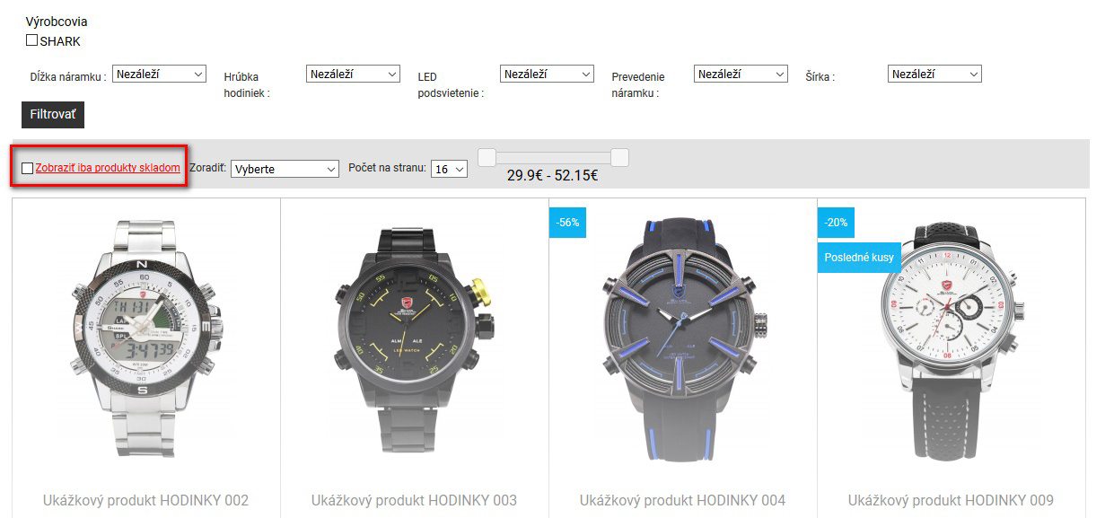 Možnosť filtrovať produkty skladom